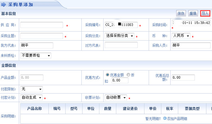 智邦国际ERP系统添加采购单界面导入产品明细