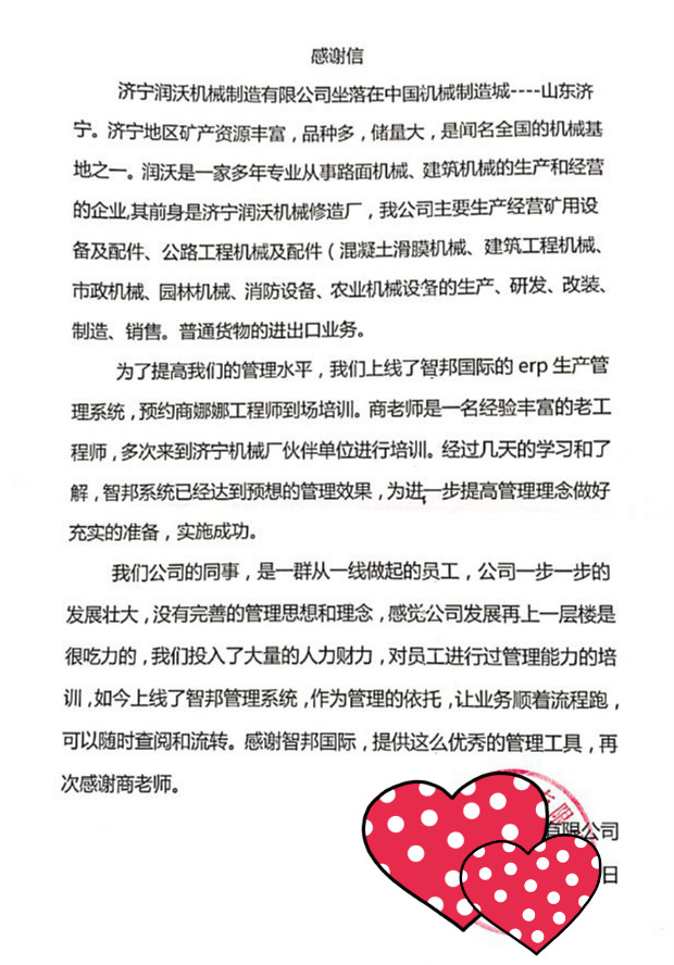 济宁润沃机械制造有限公司向智邦国际送感谢信