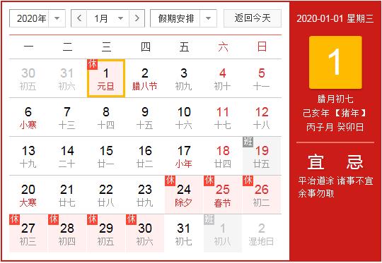 2020年1月1日(星期三,元旦)放假,共1天。放假期间若给您带来不便,敬请谅解!