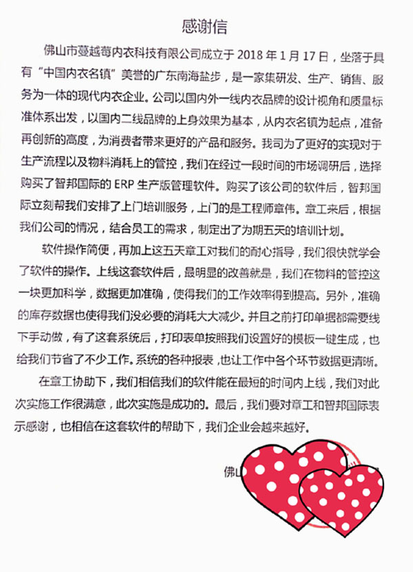 佛山市蔓越莓内衣科技有限公司向智邦国际送感谢信