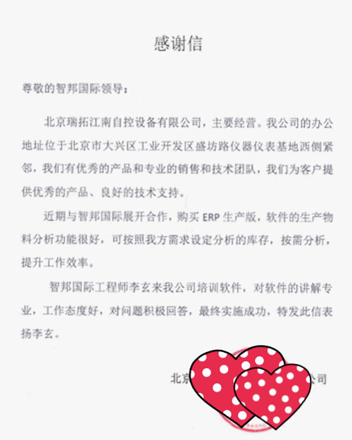 北京瑞拓江南自控设备有限公司向智邦国际送感谢信