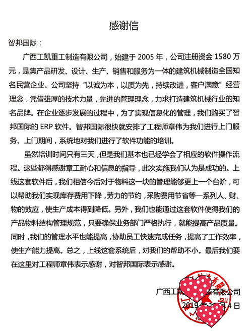 广西工凯重工制造有限公司向智邦国际送感谢信