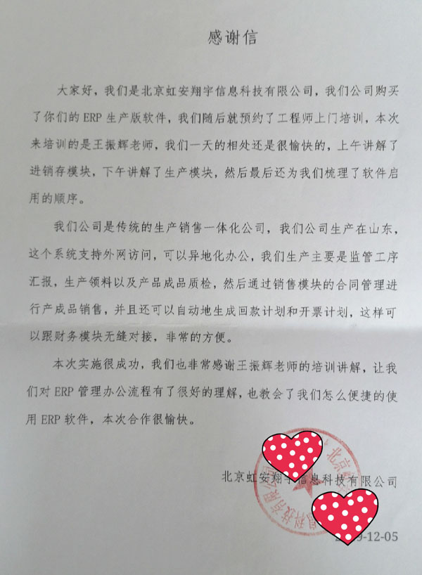 北京虹安翔宇信息科技有限公司向智邦国际送感谢信