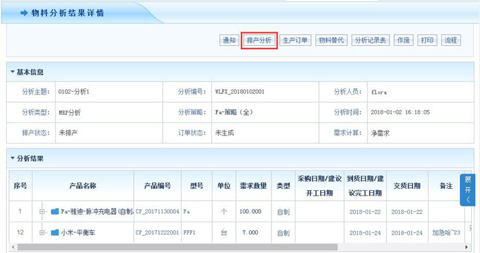 智邦国际ERP系统由物料分析结果一键生成排产分析