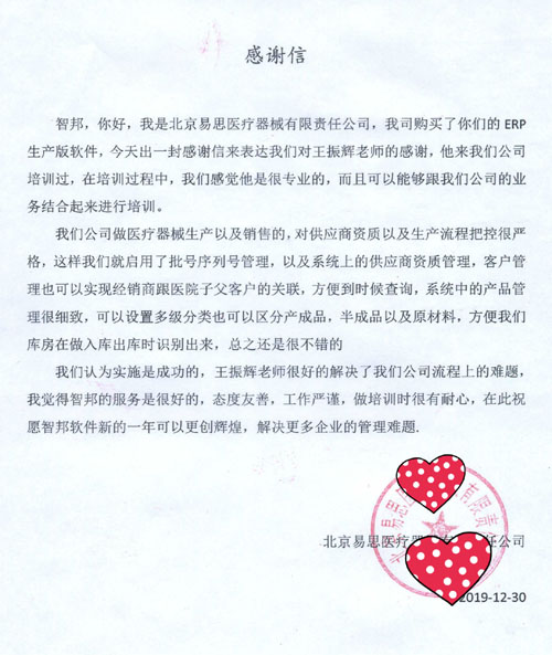 北京易思医疗器械有限责任公司向智邦国际送感谢信