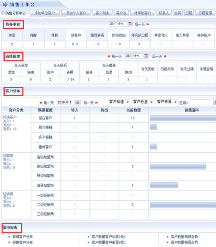 一、系统为企业提供了智能化销售工作台,让每位销售人员均可在一个界面直观查看自己每天的工作情况,例如:待查、待邮、待联等待办事宜,新增客户、在联客户、推进客户等销售成果展示,客户分类、跟进程度、当前数量等客户分布情况,以及客户分布、对比、走势等常用报表统计展示,均采用图表结合的方式,形象实时的满足销售人员对自己工作的全局把控,做到心中有数,高效追踪客户,高质达成订单。此外,如果默认的客户分析报表不能满足企业的个性化需求,也可以自定义报表样式,助力企业灵活化随需办公。