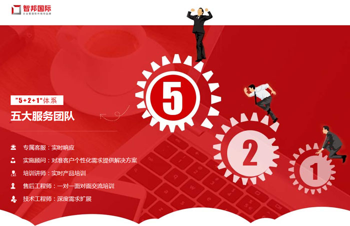 一、首先,智邦国际秉承“让客户省心、舒心、放心”的服务理念,创立了“521”立体式服务体系,竭诚为企业提供全面和贴心的服务。其中包含了线上实时响应的专属客服,对准客户个性化需求提供解决方案的实施顾问,实时产品培训的培训讲师,一对一面对面交流培训的售后工程师,深度需求扩展的技术工程师等五大服务团队,定期回访专线,实时监察专线等两条服务监察专线,以及一个客服中心。致力于通过培训服务、实施服务和在线答疑等多种形式结合,让企业快速而准确的了解软件功能架构、操作方法等,无需漫长等待即可快速投入应用。