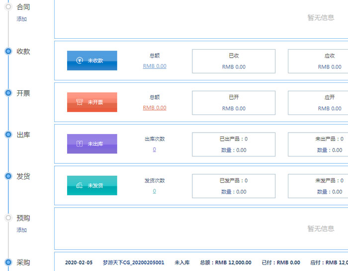 一、在系统销售栏目包含了客户、项目、报价、合同、售后等环节,其中项目环节支持企业线上一键添加项目,或是由客户、日程等直接生成项目,提高业务人员录入项目效率。同时,在项目总览环节,支持企业在一个界面即可实时查看从投资决策开始阶段到项目进度,再到项目结束等全流程,避免出现以往的纸质单据来回传递以及多个界面来回切换等情况的出现,助力企业智能化把控从初步接洽跟进、招投标、报价、签订合同、采购、出入库、收付款、生产、售后回访等全环节。