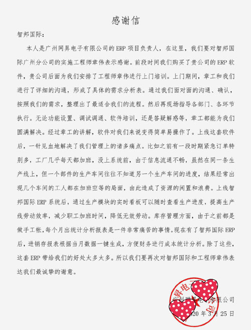 广州网昇电子有限公司与智邦国际成功签约,希望通过智邦国际ERP系统的使用,能够优化业务管理流程,合理配置企业内部资源,对各个环节实施有效管理,实时跟踪生产进度,实现资金流、物流、信息流的统一化管理,减少库存降低成本,提高企业经营决策效率与管理水平。