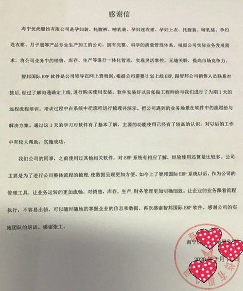 海宁优尚服饰有限公司向智邦国际送感谢信
