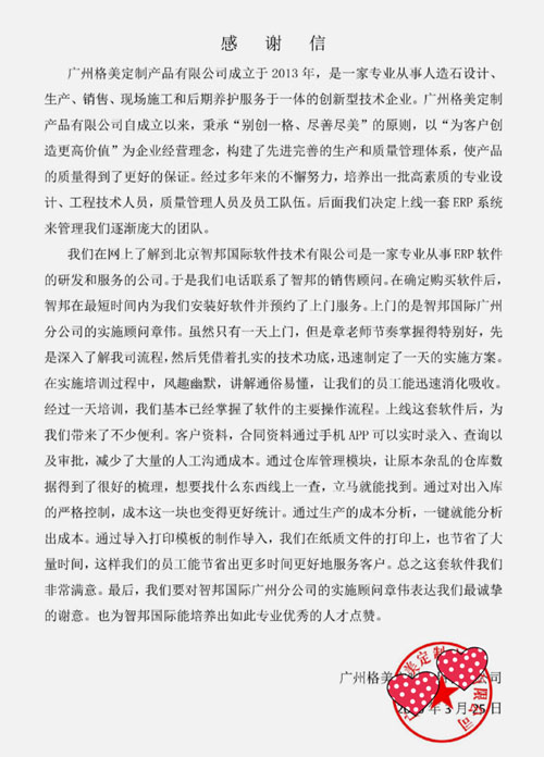 广州格美定制产品有限公司向智邦国际送感谢信