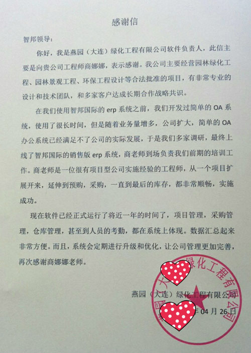 燕园(大连)绿化工程有限公司向智邦国际送感谢信