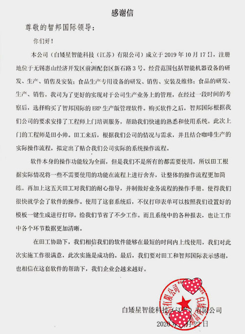 白矮星智能科技(江苏)有限公司向智邦国际送感谢信