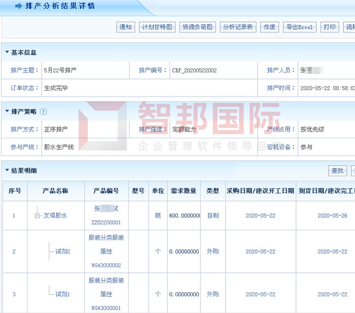 智邦国际ERP系统生产排产分析结果详情界面
