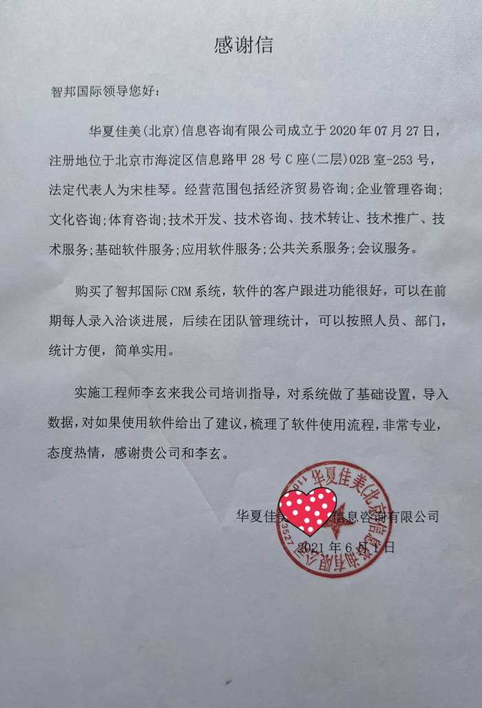 华夏佳美(北京)信息咨询有限公司向智邦国际送感谢信
