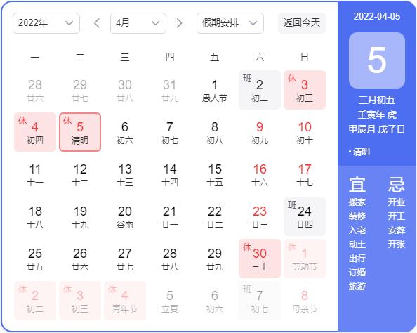 2022年4月3日(星期日)至5日(星期二,清明节)放假调休,共3天。4月2日(星期六)上班。
