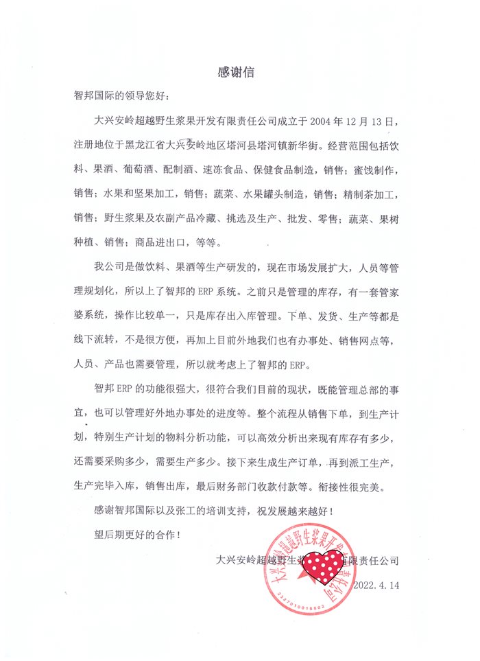 超越野生浆果开发有限责任公司向智邦国际送感谢信