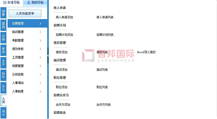 在系统人资管理环节,为企业提供了招聘、培训、考勤、绩效、工资、档案、人事管理等功能,在满足企业日常人资管理所需的前提下,简化人力资源管理流程,降本增效。其中,在招聘管理环节,企业通过线上用人申请、招聘计划建立、简历录入、面试发起等环节的优化,使得各环节操作简单,数据实时更新与流转,减少业务人员的工作量,有效降低招聘费用,帮助企业灵捷发现人才。