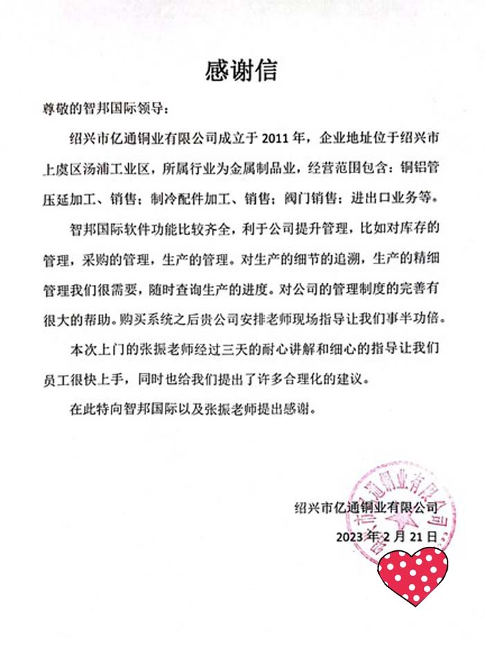 近日,绍兴市亿通铜业有限公司签约智邦国际,希望通过智邦国际ERP系统的使用,使生产速度及生产质量得到大幅度提升,为企业数字化转型赋能,全面提高市场竞争力。