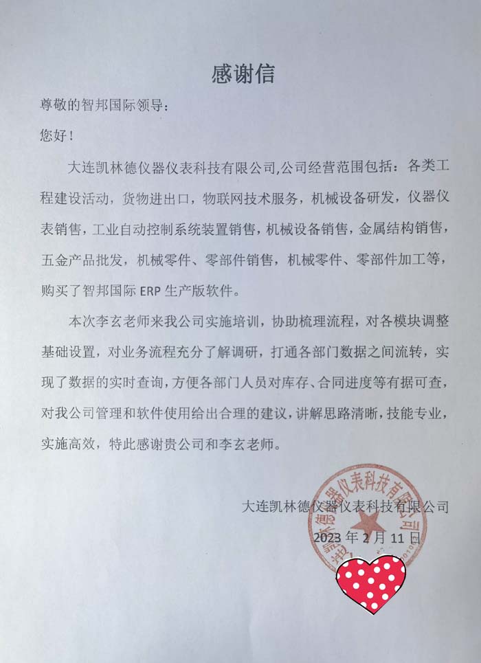 智邦国际ERP系统的实施安装有利于企业创新升级。相信通过引进智邦国际ERP系统,凯林德仪器仪表能够打造一体化运营体系,优化企业业务流程,实时追踪业务进展,开启智慧管理新篇章。