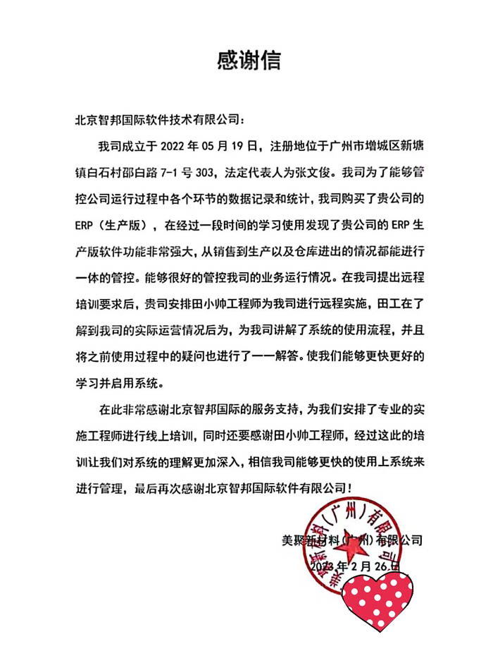 企业健康发展离不开前沿的数字化技术加持。相信通过引进智邦国际ERP系统,美聚新材料能够实现人、财、物、事的全面信息化管理,发挥上下同心、协同作战的优势,不断提高企业利润。