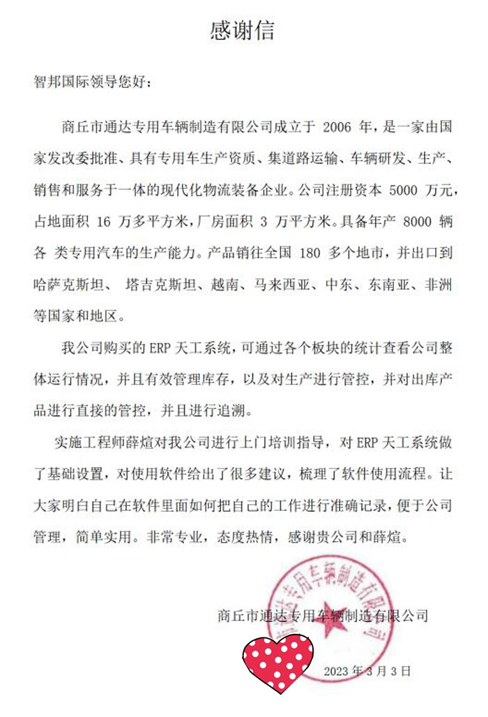 近日,商丘市通达专用车辆制造有限公司签约智邦国际,希望通过智邦国际ERP系统的使用,简化业务流程,有效提高企业资源利用率,合理控制经营成本,不断提高企业经济效益。