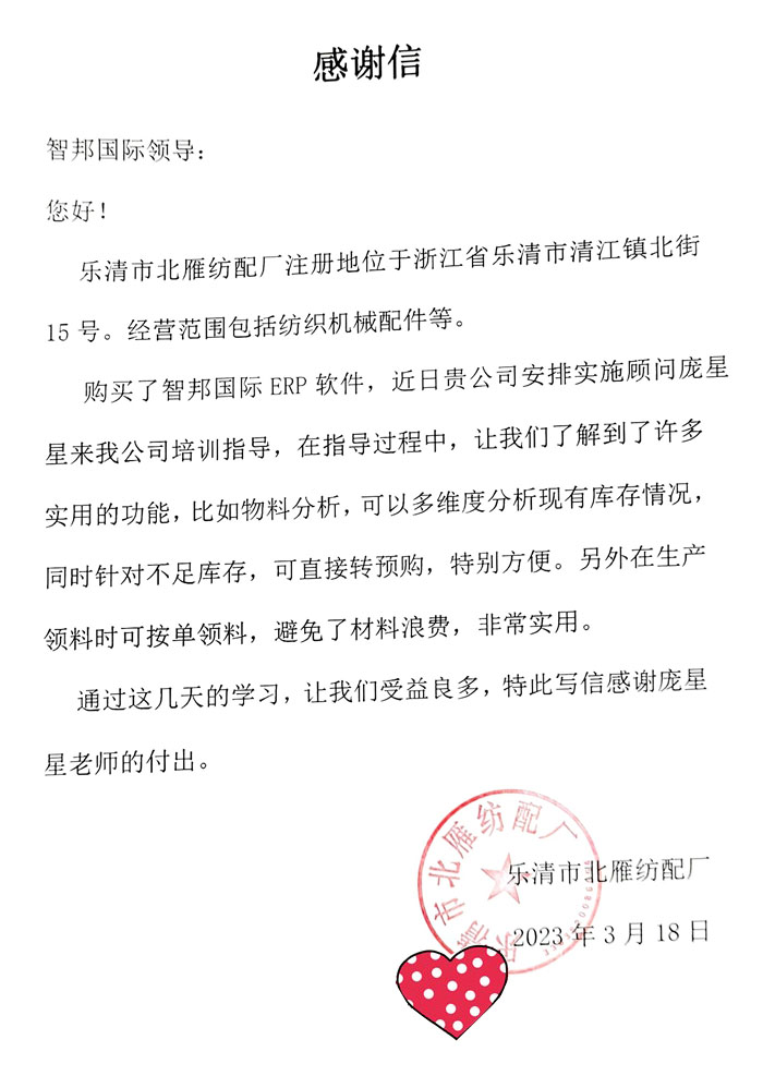 北雁纺配厂向智邦国际送感谢信
