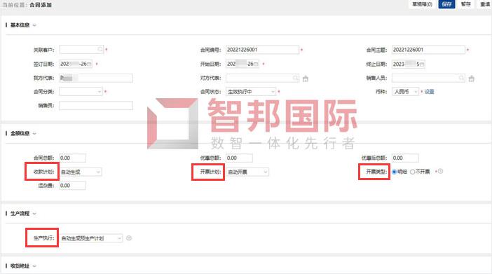 在智邦国际ERP系统中,销售人员可在线添加合同,除了录入合同基本信息外,还可自定义合同的收款计划、开票计划、开票类型等,打通销售、财务等环节信息壁垒,全程智能衔接,确保货款一致。面对紧急订单时,合同可同步生成预生产计划,将订单信息迅速推送至生产部门,加快生产步伐,提高订单准交率。