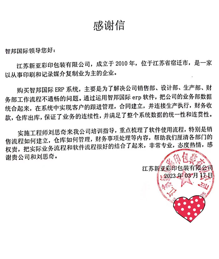 新亚彩印包装向智邦国际送感谢信