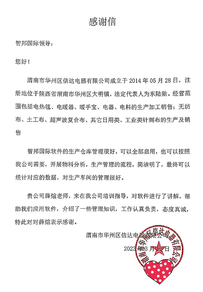 近日,渭南市华州区信达电器有限公司签约智邦国际,希望通过智邦国际ERP系统的使用,建立标准化、可视化生产流程图,一体化驱动高效生产。