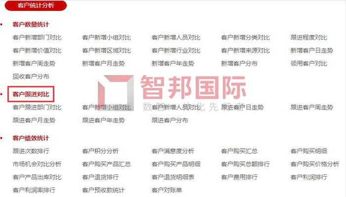 另外,智邦国际ERP系统将海量销售数据智能统计分析,从客户数量、客户跟进、客户绩效等维度出发,深度挖掘数据价值,为企业经营和决策提供正确的数据支撑。在系统中,可进行客户跟进部门对比、客户新增小组对比、客户新增人员对比等,还可直观呈现跟进客户日走势、跟进客户周走势、跟进客户月走势、跟进客户年走势等,深度分析当下的客户跟进状态,便于企业及时发现、解决客户跟进中的问题。
