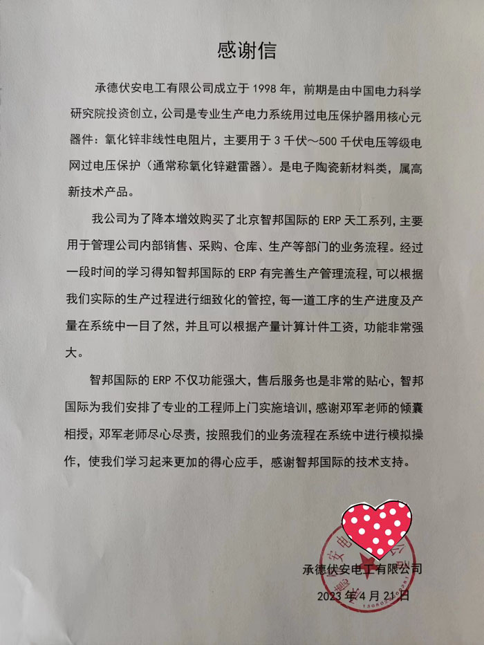 伏安电工向智邦国际送感谢信