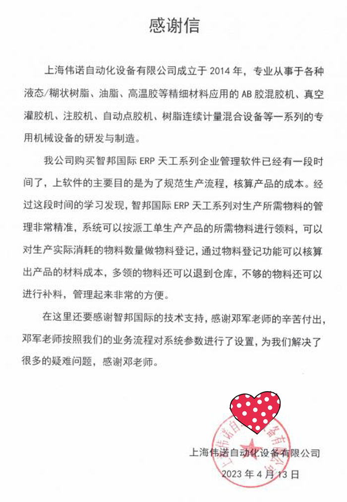 伟诺自动化设备向智邦国际送感谢信