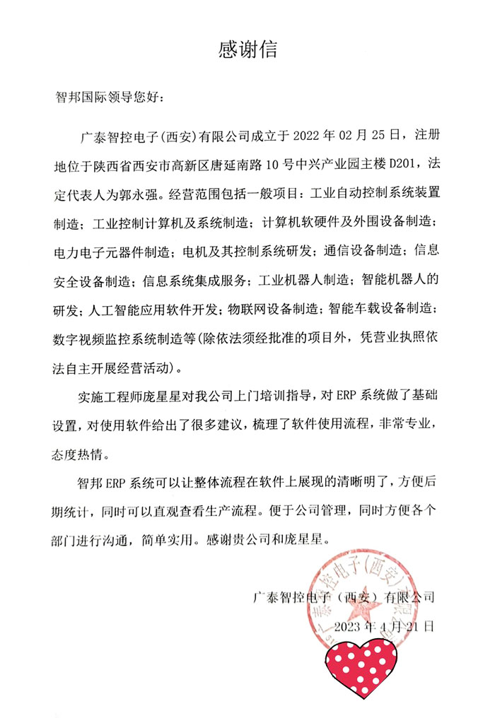 广泰智控电子向智邦国际送感谢信