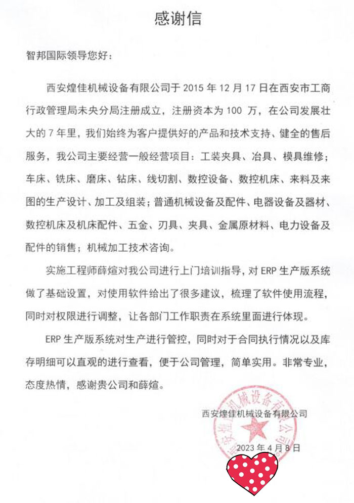 煌佳机械设备向智邦国际送感谢信