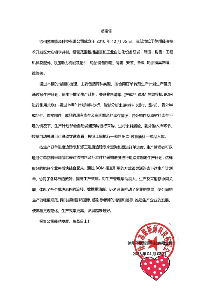 近日,徐州苏煤能源科技有限公司签约智邦国际,希望通过智邦国际ERP系统的使用,建立规范、灵敏的业务流程,生产过程自动化、智能化,全面提高企业生产质量与生产效率。