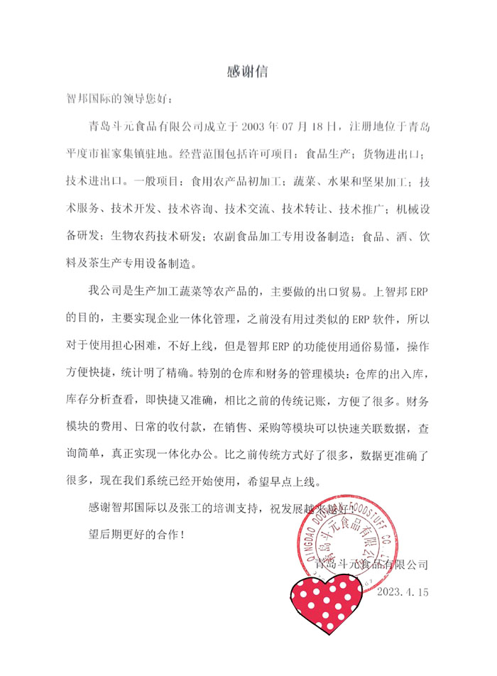 近日,青岛斗元食品有限公司签约智邦国际,希望通过智邦国际ERP系统的使用,搭建合规的一体化管理架构,提高数字化管理水平,开辟出新的经营模式,助推企业高质量发展。