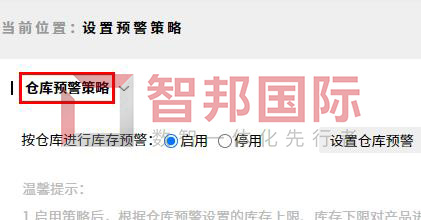 功能价值:智邦国际32.09版本,新增精细化库存预警管理,支持按仓库进行库存预警,是否开启完全企业自己决定,仓库和库存管理更精细;并可精细化设置仓库内每种产品的库存上限、下限,库存高于上限、低于下限时,自动库存预警,提醒更精准;与原有按统一库存上下限预警配套使用,设置更灵活,库存调度、补货、清仓、管理、决策等,有据可依,实时高效。