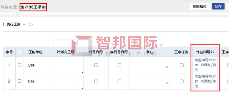 功能价值:智邦国际32.09版本,新增工序级生产作业指导书,生产全流程单据,支持增加“作业指导书”,图片、PDF等格式,或添加、上传、下载、查看、预览、复制、删除等均可,以便进行工序级的生产作业指导、安全作业下发、机器设备调试等,让规范化、标准化、可视化制度准则等伴随生产制造每一步,助力全流程高质量生产制造和交付,大大降本提效增质!