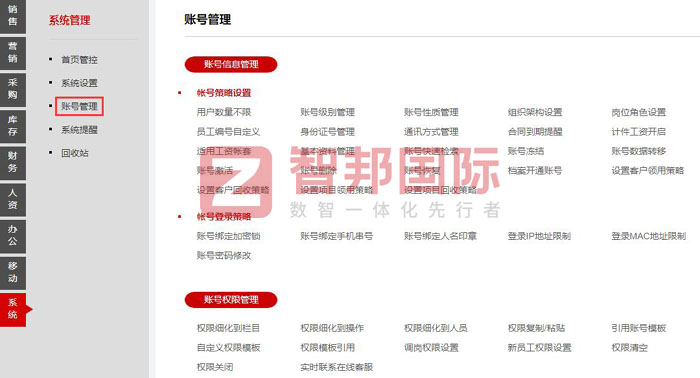 智邦国际ERP系统账号管理功能表(局部图)