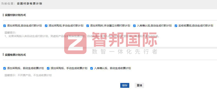 在付款开票环节,智邦国际ERP系统设有智能化付款收票计划设置功能,企业可根据自身管理场景,自定义设置付款计划方式,比如,添加采购后,自动生成付款计划;添加采购后,手动生成付款计划;添加采购时,手动建立分期付款计划;入库确认后,自动生成付款计划;实收收票后,自动生成付款计划。