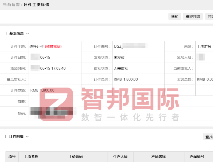 智邦一体化ERP生产版设有智能化生产工资管理功能,可直接添加计件、计时工资,自定义设置计件工价、计时工价,系统自动统计形成计件工资明细表、计时工资明细表。在计件工资详情界面,能够看到工资的发放状态和计件总价,精准核算,科学管理。以计件工资添加为例,可直接关联单据主题,简单快捷,且能够准确定位具体的订单环节。清晰的数据呈现方便各层级人员实时查看,透明化生产工资管理流程,消除企业信息孤岛,提高运营效率。