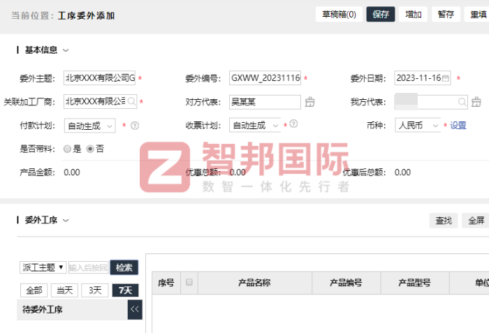 智邦一体化ERP天工系列工序委外添加(局部图)