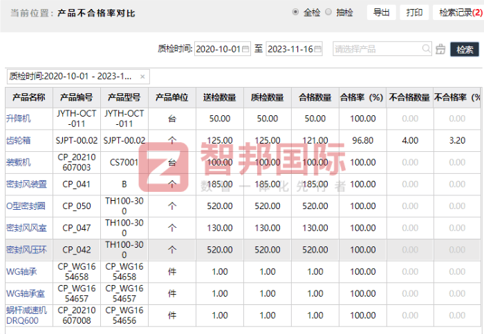 智邦一体化ERP天工系列产品不合格率对比(局部图)