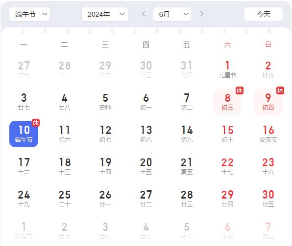2024年6月10日(端午节,星期一)放假,与周末连休。6月11日(星期二)上班。