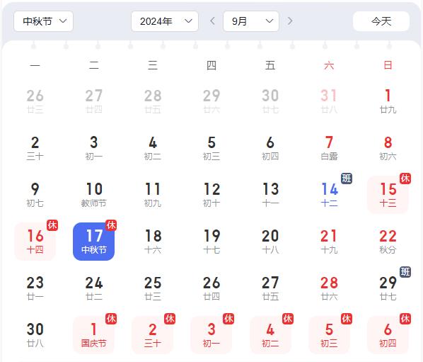 2024年9月15日(星期日)至9月17日(中秋节,星期二)放假调休,共3天。9月14日(星期六)上班。放假期间若给您带来不便,敬请谅解!