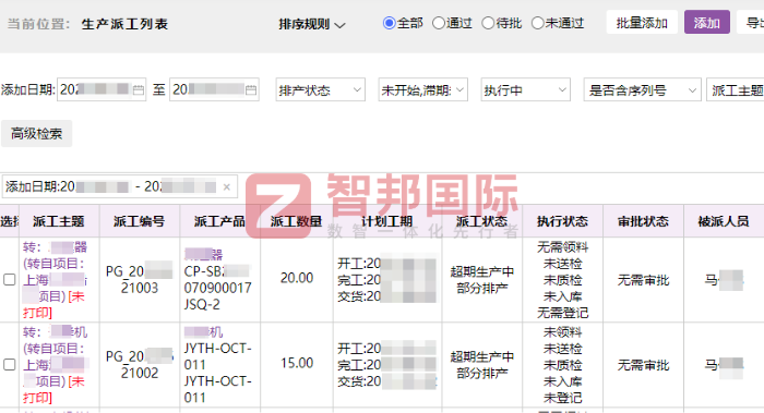 智邦一体化ERP电工电气行业系列生产派工列表(局部图)