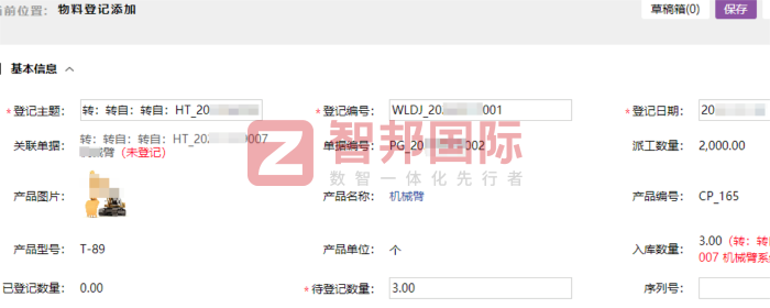 智邦一体化ERP天工系列物料登记添加(局部图)